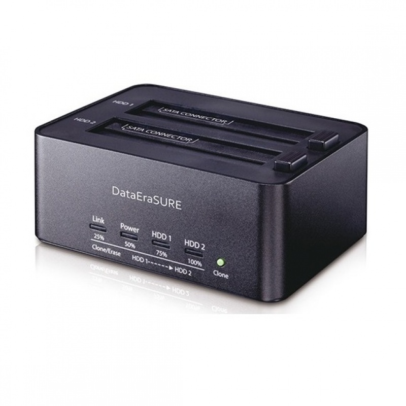 另外,DataEraSURE還有磁碟拷貝的功能。在操作時和資料消除一樣,必須切斷與電腦的連接,並將欲拷貝的來源磁碟裝入HDD 1的插槽中,而目標磁碟放在HDD 2的位置,且目標磁碟的容量必須大於或等於來源磁碟,並按壓前方的複製按鈕(Clone)4秒,就會自動進行磁碟的複製,當2臺硬碟的容量條件不符合時,DataEraSURE就會以燈號警示,且無法進行拷貝。
